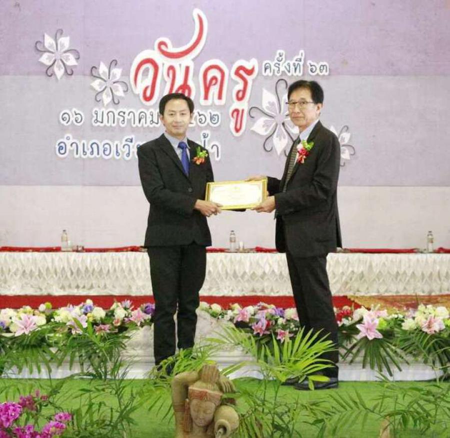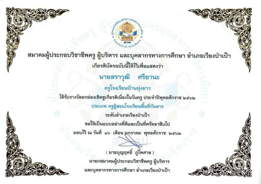 นายสราวุฒิ ศรียานะ ครูโรงเรียนบ้านทุ่งยาว ได้รับรางวัลครูดีเด่น ของสมาคมผู้ประกอยวิชาชีพครู ผู้บริหาร และบุคลากรทางการศึกษาอำเภอเวียงป่าเป้า เนื่องในวันครู 2562