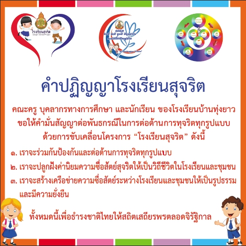 โรงเรียนบ้านทุ่งยาว ประกาศปฏิญญาโรงเรียนสุจริต เพื่อเป็นพันธสัญญาในการดำรงไว้ซึ่งความสุจริตและโปร่งใสในการบริหารงานและเพื่อปลูกฝังคุณธรรมจริยธรรมสำหรับนักเรียนสืบไป#งานโรงเรียนสุจริต คิดดี ทำดี พูดดี มีคุณธรรม# 3 ดี 4 คุณธรรม