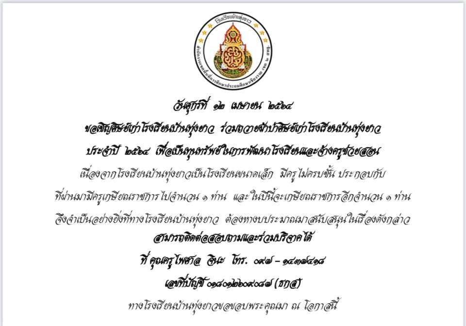 เรียนเชิญร่วมทำบุญจัดหาทุนทรัพย์เพื่อสนับสนุนการจัดการศึกษาโรงเรียนบ้านทุ่งยาว ประจำปี 2564 ติดต่อสอบถามร่วมทำบุญได้ที่ คุณครูไพศาล จินะ โทร: 0971437418 หมายเลขบัญชี 018012609087 ธนาคาร ธกส.สาขาแม่ขะจาน